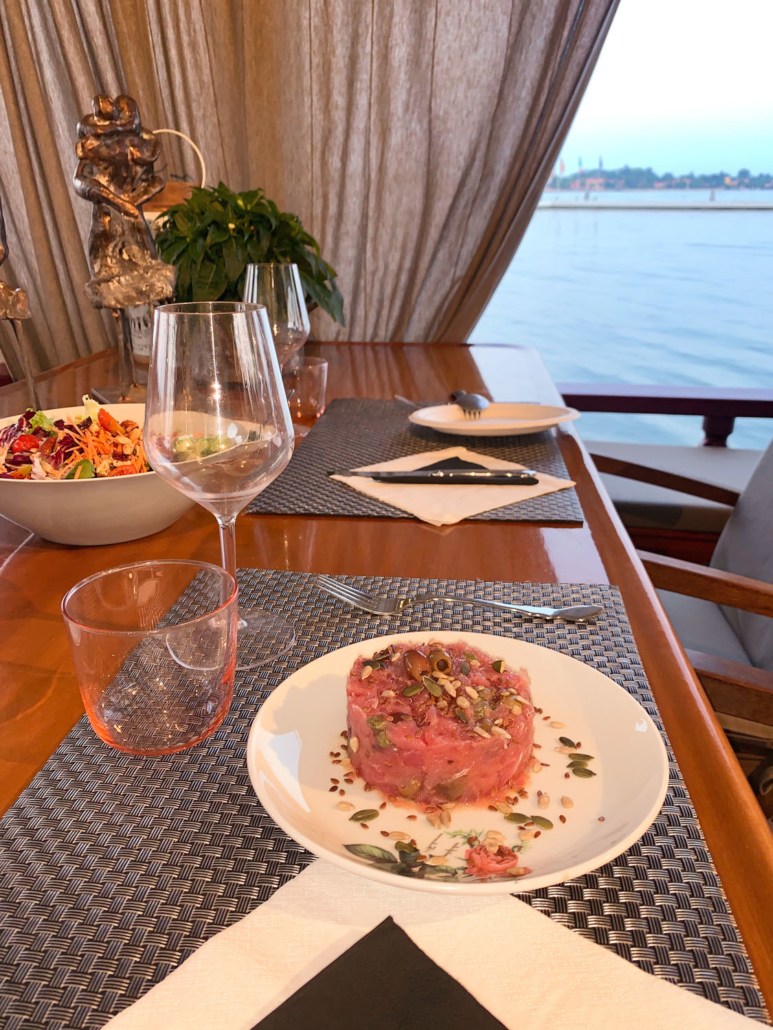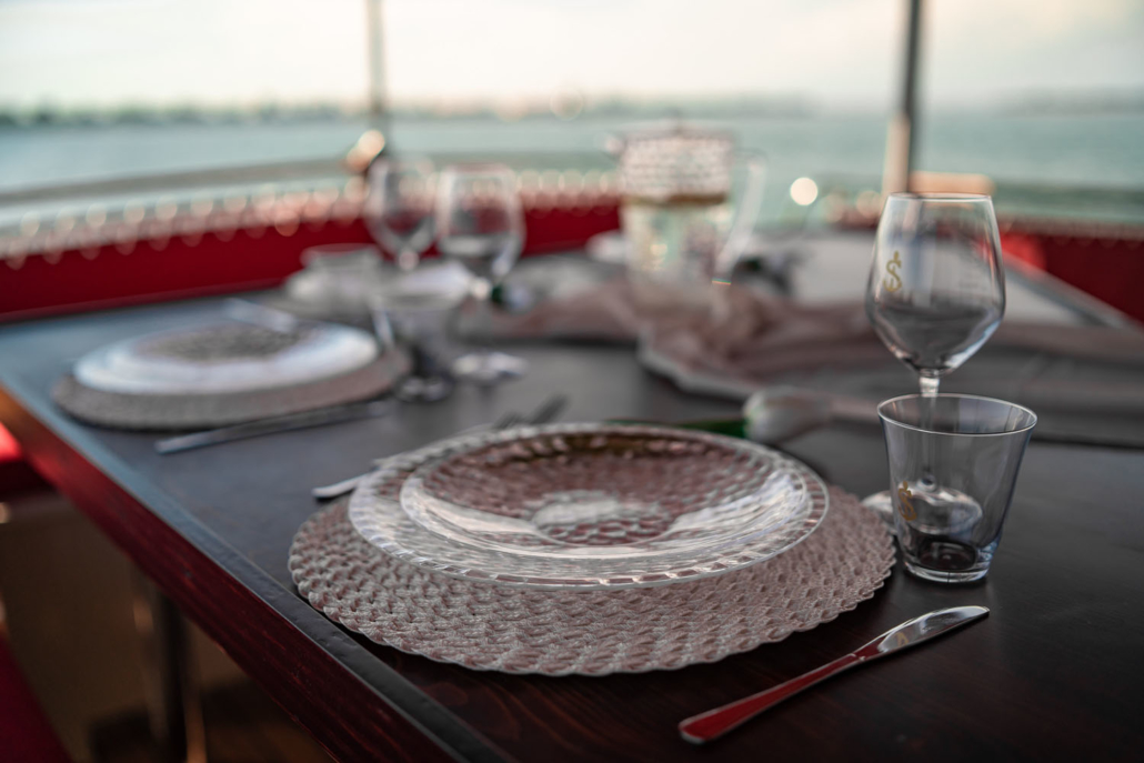Il nostro catering con servizio al tavolo è fruibile sia sulle nostre imbarcazioni (possiamo ospitare fino a 250 persone a sedere sulla medesima) oppure su altre barche e yacht con un catering esterno.