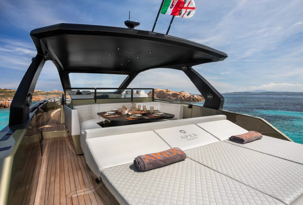 La modernità nelle linee definite e minimal dello yacht Apex, lo rende la location perfetta per una lussuosa navigazione in Costa Smeralda tra amici, una crociera con la famiglia o una cena elegante.